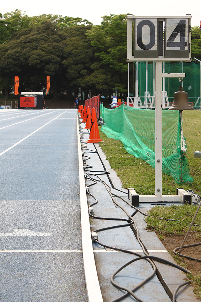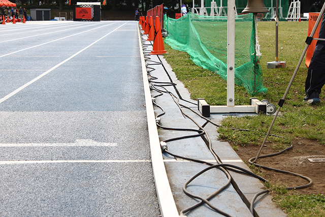 東海大学 湘南キャンパス 陸上競技場に常設した電子ペーサープロトタイプは、トラック脇に設置した制御機器と、制御指示を出すノートPC(設定ソフト)でそれぞれの選手たちの目標を設定し、2本のケーブルでつながった LED発光器 を光らせる。