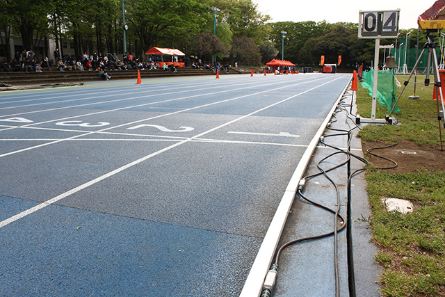 東海大学と高見沢サイバネティックスが共同開発した電子ペーサーは、トラック上の LED発光機器でランナーのペースを誘導。