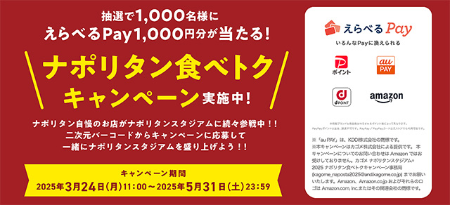 そして抽選で1000名に、選べるPay1000円分が当たる、ナポリタン食べトクCPも 5/31 まで実施中!
