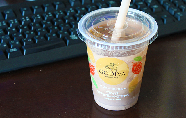 こうして PC デスクにおいて、ひと息つくときにも、ファミリーマート「ゴディバWチョコレートフラッペ」(498円)ガチおすすめ。