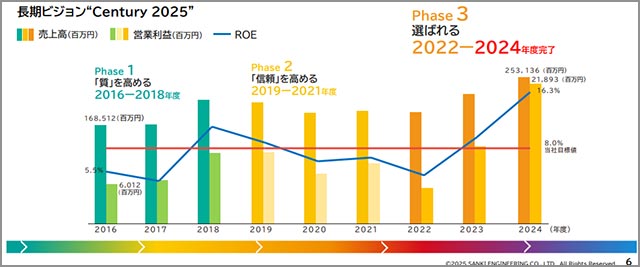前中期経営計画(Phase3)“Century2025” 期間中の業績推移をみると、Century2025 の9年間を通じて、売上高・営業利益ともに増収・増益を達成。