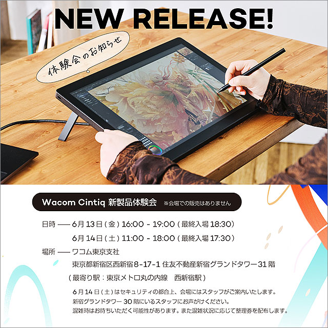 さらに、ワコム東京支社(東京都新宿区西新宿8-17-1 住友不動産新宿グランドタワー31階)で、6月13日(金) 16:00 - 19:00 (最終入場18:30)、6月14日(土) 11:00 - 18:00 (最終入場17:30)の2日間、Wacom Cintiq 新製品体験会を開催するから、「いち早く触ってみたい!」という人は、現地でチェックしてみて。