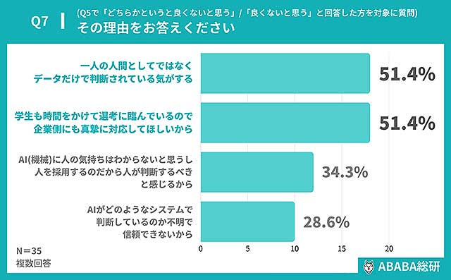 企業の生成AI活用について、否定的な回答をした就活生にその理由を聞くと、「学生も時間をかけて選考に臨んでいるので、企業側にも真摯に対応して欲しいから」、「一人の人間としてではなく、データだけで判断されている気がする」という回答が同率で51.4%。