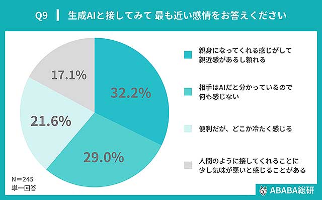 次いで「相手はAIだとわかっているので、何も感じない」(29.0%)、「便利だが、どこか冷たく感じる」(21.6%)、「人間のように接してくれることに、少し気味が悪いと感じることがある」(17.1%)と続いた。