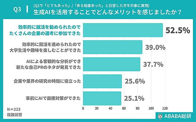 生成AI利用の具体的なメリットを聞くと、「効率的に就活を進められたので、たくさんの企業の選考に参加できた」という回答が52.5%。