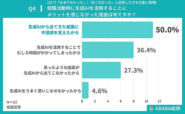 いっぽうメリットが「あまりなかった」「まったくなかった」と回答した就活生にその理由を聞くと、「生成AIから出てきた結果に不信感を覚えたから」が50.0%、「生成AIを活用することでむしろ時間がかかってしまったから」が36.4%、「思ったような結果が生成AIから出てこなかったから」が27.3%と続いた。