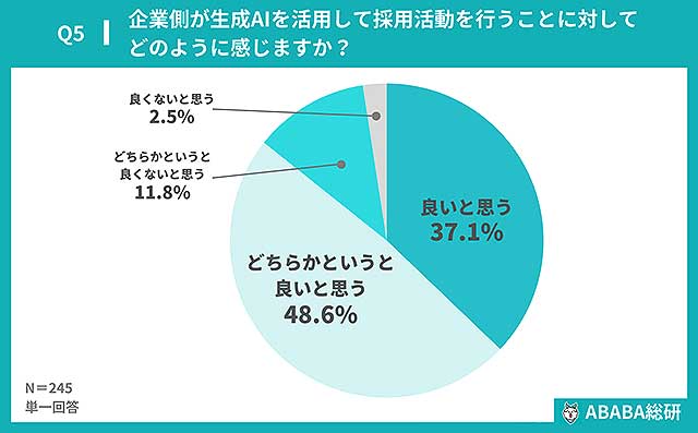 企業側の採用活動における生成AIの利用について、「良いと思う」(37.1%)、「どちらかというと良いと思う」(48.6%)という結果で、肯定的な回答が8割以上という結果に。