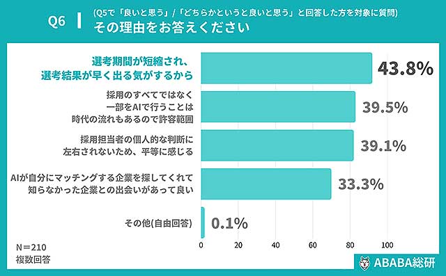 企業の生成AI活用について、肯定的な就活生にその理由を尋ねると、「選考期間が短縮され、選考結果が早く出る気がするから」という回答が最も多く、43.8%。