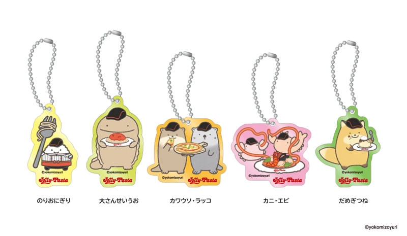 キーホルダーのデザインは、ジョリーパスタの制服や帽子を身に着けた「なんでもいきもの」のキャラクターたちがパスタやピッツァを持っている、このコラボだけの特別な描き下ろしイラストです。