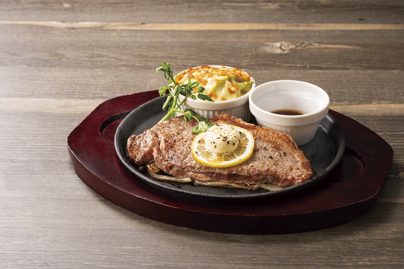 肉質に優れたアンガス牛のサーロインステーキに、爽やかなレモンとコクのあるバター醤油を合わせた夏にぴったりの一品。クリーミーな「アボカド・タルタル・ポテトサラダ」のグラタンが添えられています。