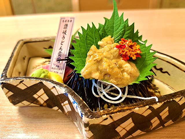 まずは香川県内「遊食房屋」丸亀店(https://www.yusyokubouya.com/)で、「讃岐うどん雲丹(お刺身)」(1,650円)が1日限定10食で販売中。