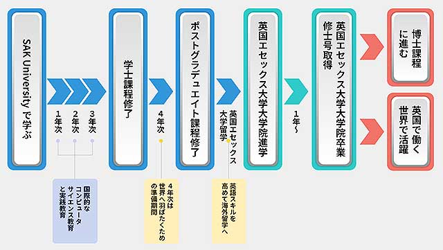 SAK University で4年間の課程を修了して英国国立エセックス大学の卒業資格(学士号)、(ポストグラデュエイト・ディプロマ)を取得後、英国エセックス大学大学院へ留学が可能。