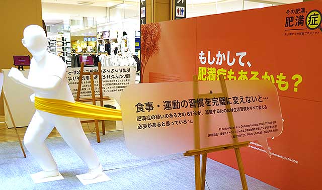 会場には、肥満症をイメージしたオブジェや、「メタボリックドミノ」をイメージしたドミノオブジェの展示のほか、タブレットPC上のクイズで肥満と肥満症の違いが楽しく学べる学習コンテンツ、肥満症かどうかセルフチェックができるコーナーもあるから、気になる人はここでチェックしてみて。