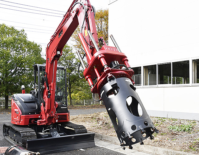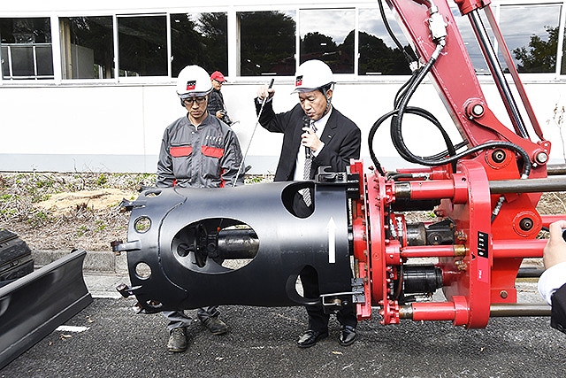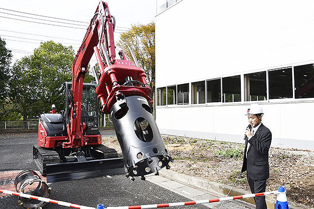 「これまで複数人がチェーンソーを用いて長時間もかけ、騒音や周辺への影響をともないながら行ってきた木の根の切断作業を、従来の油圧ショベル用アタッチメントとしたことで、大幅な効率化を実現している。