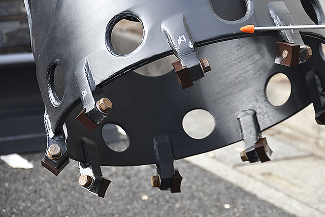 アクティオ自社開発「根こそぎ切るソー」は、バックホーに円筒形のホールソーを装着し、切り株にかぶせて回転させることで、地中の根を安全かつ効率的に切断します。