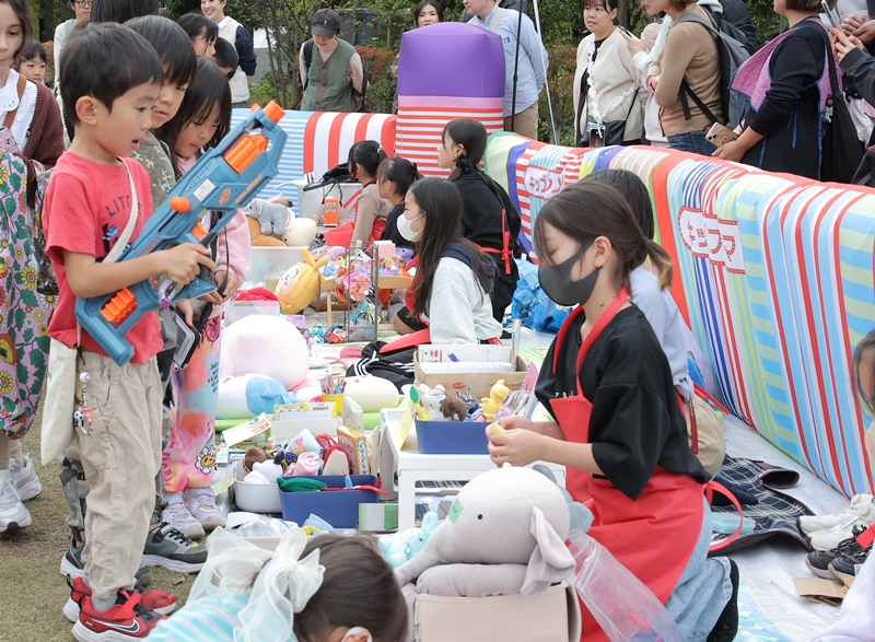 子どもたちが持ち寄った絵本やスーパーボールなどのおもちゃが売られ、親たちも「お金の管理や使い方のいい勉強になると思って参加しました。商売の楽しさをイベントを通じて学べるのはいいことだと思います」と語った。