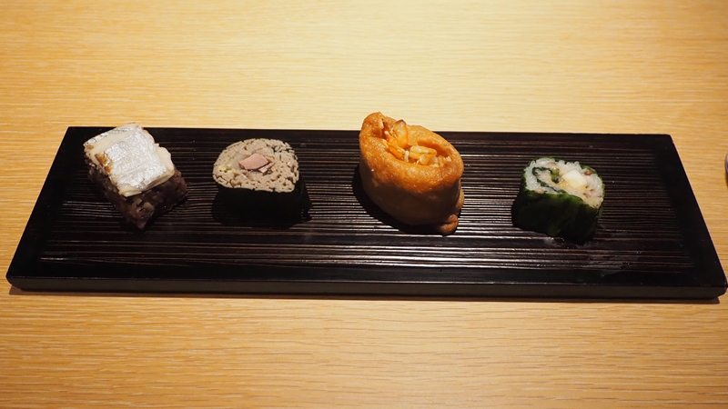 地元の川魚や山の幸を使い、柚子やかぼすの香りをきかせた上品な味わいが特徴。青い高菜で巻いた。写真では分からないが、埋め込まれた長芋が食感のアクセントになっている。