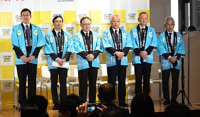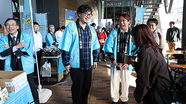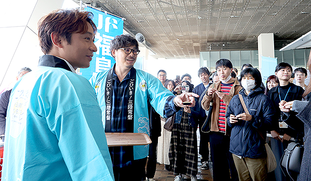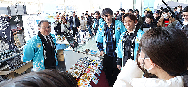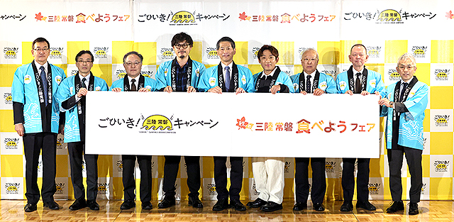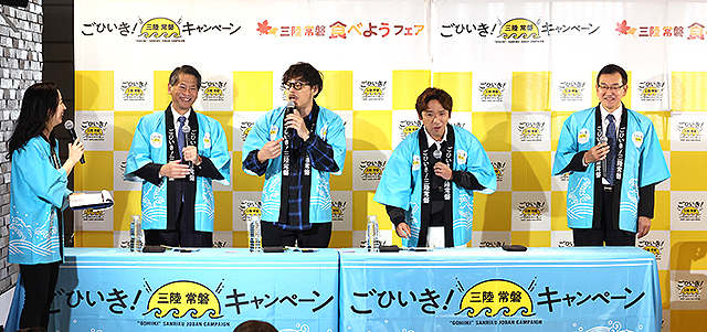 千葉から北、茨城・福島・宮城・岩手・青森の太平洋沿いでとれた “ご当地 海の幸” を思いっきり味わえる「ごひいき!三陸常磐キャンペーン in 豊洲場外マルシェ」(11/15 @東京 ミチノテラス豊洲)に、アルコ&ピース 平子祐希 酒井健太や経済産業省 山田賢司 副大臣らが駆けつけ、来場者たちにその旨さをプッシュ。