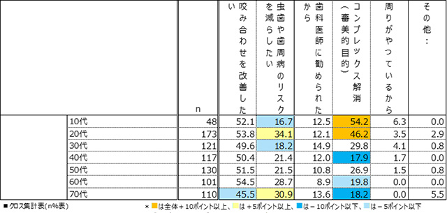 ◆若年層の矯正歯科治療を検討するおもな動機は、約半数が「コンプレックスの解消」など審美目的であり、情報源の約54%がSNSだった。