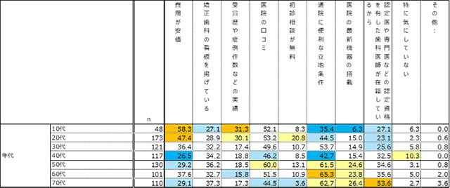 ◆歯科医院選びの注目ポイントとして、若年層の約5割前後が「費用の安さ」を重視していた。
