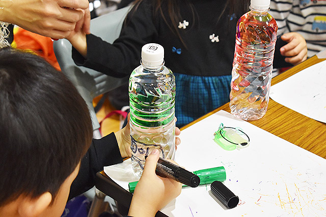 今回のワークショップではそこにアイデアをプラスし、来場者がマジックペンでペットボトルに自由に色を塗ったり絵を描いたりして、世界にひとつだけのペットボトルランタンをつくります。