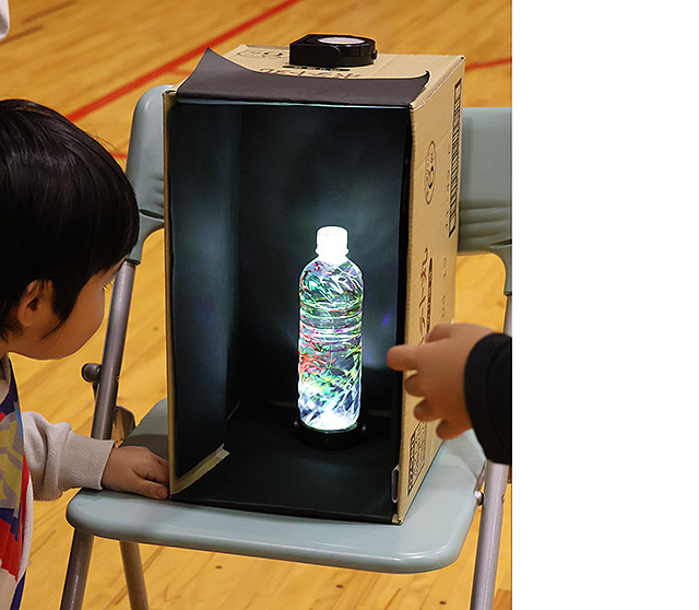 完成したペットボトルをライトの上に置くと、子どもたちがペンで塗った色とりどりの光が綺麗に広がりました。
