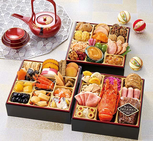 内容 : 和の重は、伝統的なおせち食材と、こはだかぶら和えや柔らかく炊き上げた白花豆煮。洋の重は、十勝ハーブ牛ローストビーフやロブスター。中華の重は、豚を黒糖で仕上げたローストポークと鮑煮が入った豪華なお重となっております。