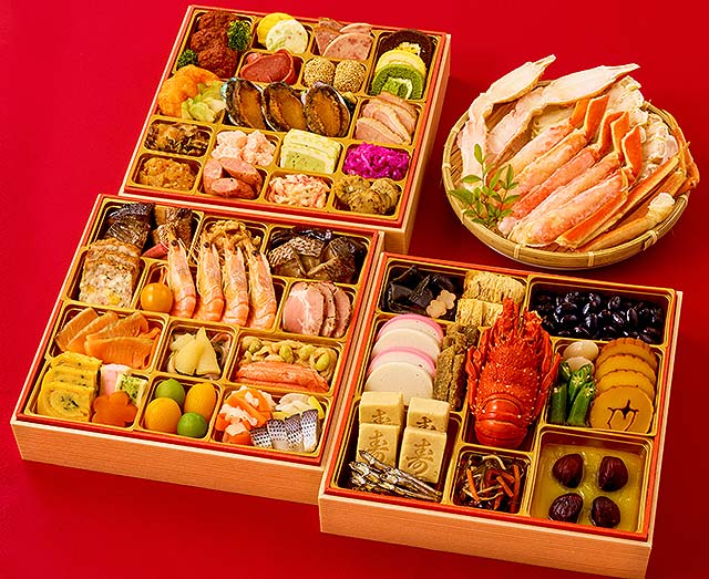 内容 : ロブスター・あわび・花咲ガニ・大ぶりな海老など与段重の全てに目を引く豪華な料理を配し、おせちの定番や魚介類、肉類、煮物などバランス良く67種の料理を盛り込んだ充実の内容です。ご家族や親戚の集まられる食卓に華やかさと豪華さを演出します。