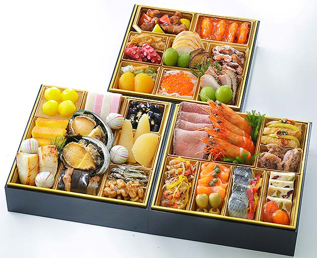 内容 : 伝統的な和の味わいと彩り豊かな和洋折衷の品々をお楽しみいただける二段重です。豪華なローストビーフや味わい深い蝦夷あわびの旨煮など、和と洋の贅沢な味わいが詰まっています。