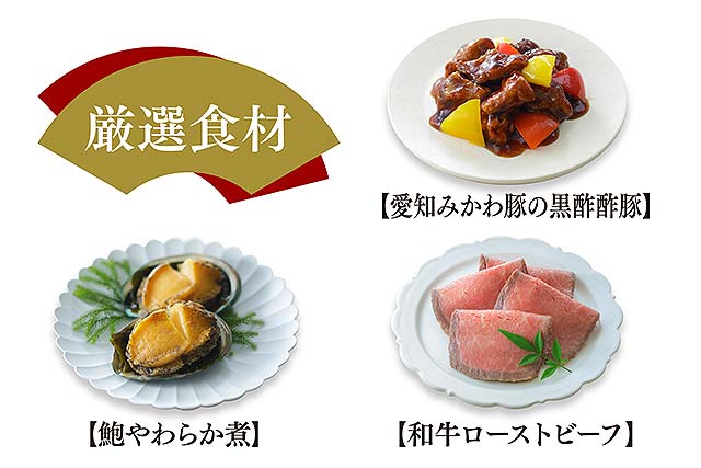 多彩な味わいの和洋中三段重に、鮑(あわび)や和牛ローストビーフ、愛知みかわ豚の黒酢酢豚などプレミアム食材をふんだんに盛り込みました。