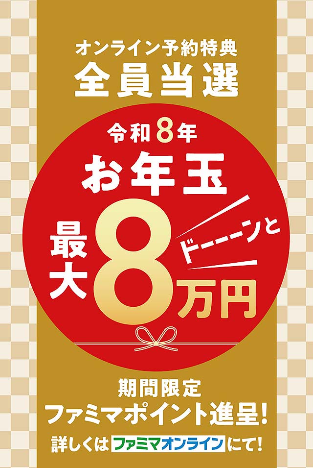 しかも、ファミマオンラインで予約すると、はずれなしの抽選に参加できて、最大8万円分相当のファミマポイントが当たるから、オンライン予約がいいかも♪♪