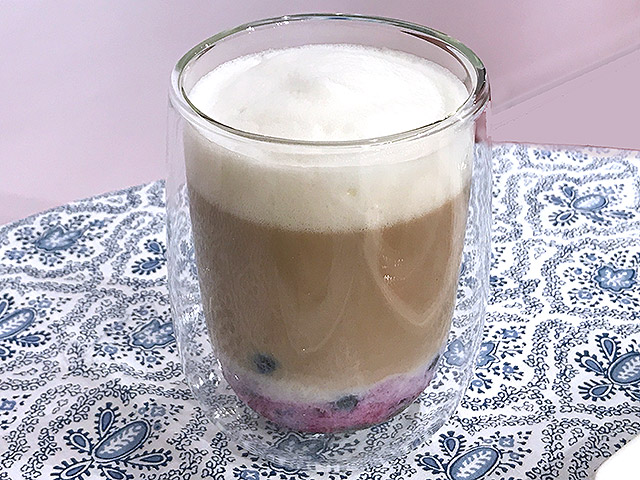 作り方:1)ブルーベリー、はちみつ、レモン汁を加え電子レンジで30秒加熱し、混ぜる。2)豆乳50mlは電子レンジで30秒温め、泡立てフォームミルクにする。残りは温める。3)ダブルウォームグラスにブルーベリーをいれ、豆乳150ml、コーヒーを静かに注ぐ。フォーム豆乳ミルクをのせる。