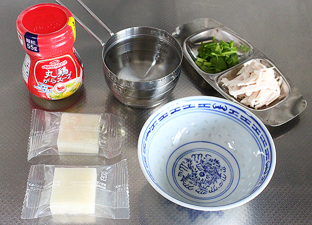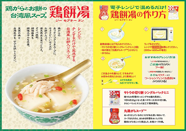 「鶏餅湯」(ジーモアチータン)は、「サトウの切り餅シングルパックミニ」に「丸鶏がらスープ」と水を加え、レンチンするだけ。