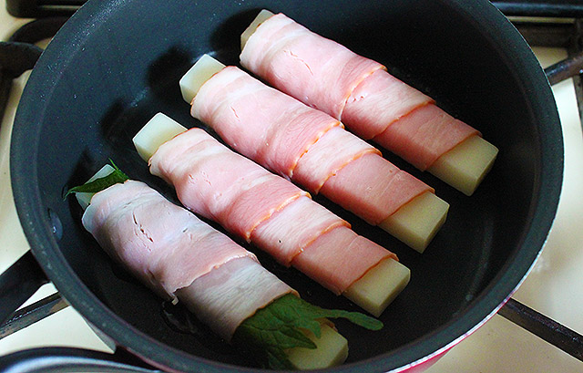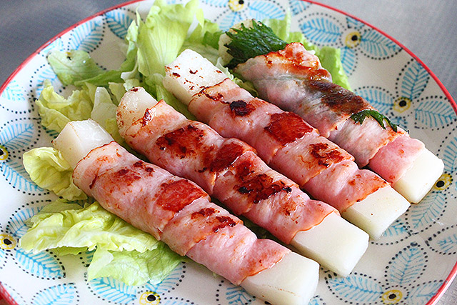 これも超かんたん。「サトウの切り餅いっぽん」にベーコンを巻いて、フライパンへ。もうひと味加えたいってなったら、たとえば大葉(青じそ)をはさみこんで焼いてもOK。