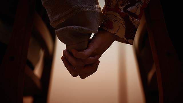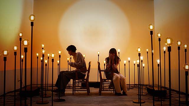 来場者は、暗闇の空間で背中合わせに座り、互いの姿が見えない状態で手を握り合う。
