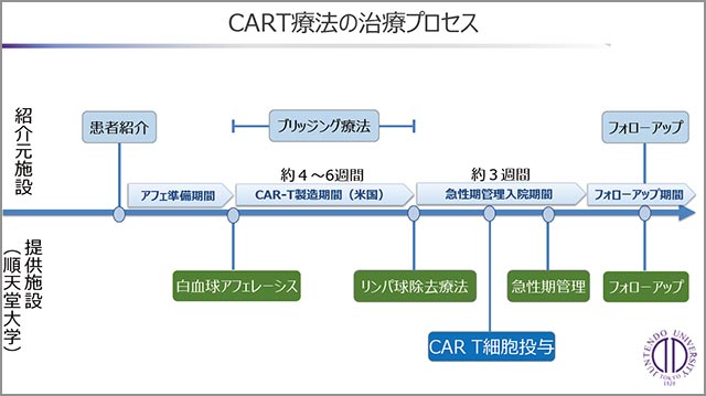 「CAR-T細胞療法では、まずは患者さんご自身の血液から透析のような機械を使ってリンパ球を採取します(白血球アフェレーシス/図参照=以下同)。かかる時間は平均して3~4時間。リンパ球の中にT細胞が含まれているわけですが、いかにたくさんの、そして質の良いT細胞を取り出すかが重要となります。採取したリンパ球は順天堂大学で凍結もしくは冷蔵し、海外にあるCAR-T細胞の製造施設へ迅速に輸送されます。CAR-T細胞が製造され、順天堂大学まで戻ってくるまで平均4~6週間。それまでの間は、必要に応じて抗がん剤や放射線治療を行います(ブリッジング療法)。そうやって患者さんの病状を安定させるのです。CAR-T細胞が完成し、冷凍保存で到着したら、効果をより高めるためにリンパ球除去療法を行い、直前に解凍したCAR-T細胞を5~10分ほどかけて輸注します」