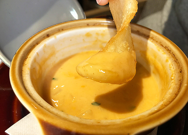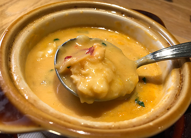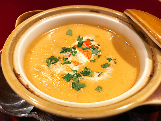 「オマール海老のビスク」は、海老、蟹のなど甲殻類から出る旨みをベースに、フュメ・ド・ポワソン(魚介だし)や貝柱のだし、さらに牛乳、生クリームを加えクリーミーに仕上げたひとしな。