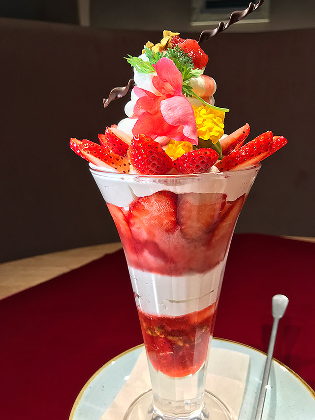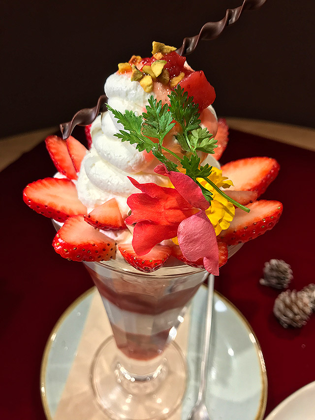 フレッシュなイチゴにストロベリーアイス、食べやすいクレームシャンティを添えた、南国のお花をイメージしたパフェ。
