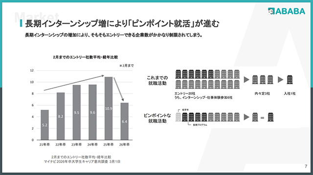 ―――さらに、こうした汎用的能力・専門活用型インターンシップ(タイプ3)の普及で、ピンポイント就活、採用難易度上昇、内定数減、就職活動長期化といった傾向が顕著化すると ABABA はみている。