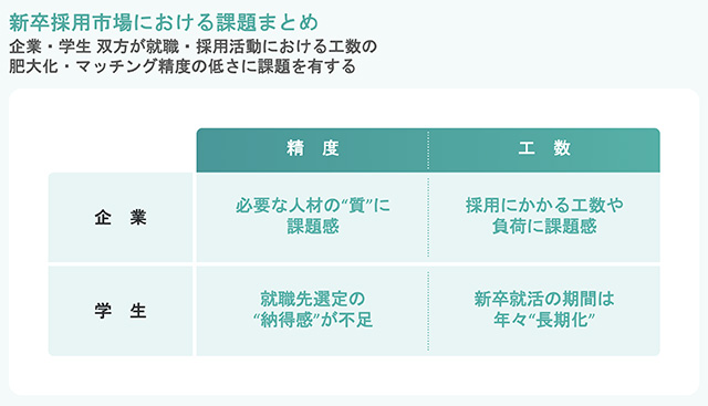企業は求める人材要件(質)を十分に満たせないことに悩み、学生も供給過多ぎみとなっている情報の中で入社先決定に対する「納得感」が不足したまま活動を終えるケースが少なくありません。