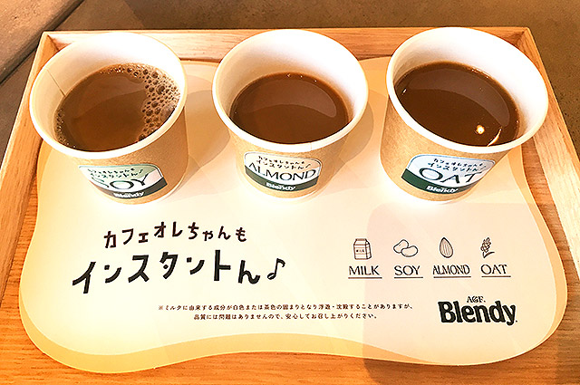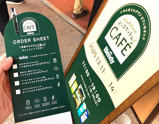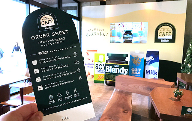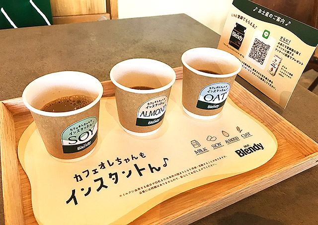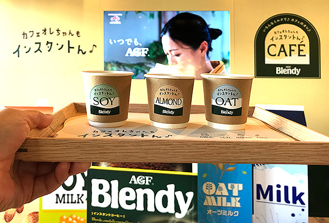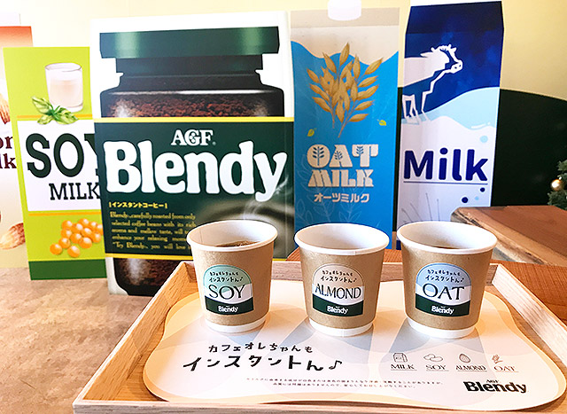 期間限定ポップアップ『カフェオレちゃんもインスタントん♪ CAFÉ by Blendy』(12/11~12/14 @東京 明治公園)では、「ブレンディ」インスタントコーヒーと 4種類のミルク(牛乳・ソイ・アーモンド・オーツ)の組み合わせのうちお好みのミルク3種類を選んで、“カフェオレ”を無料で飲み比べできるチャンス。