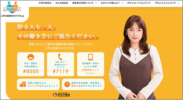 ―――そんなメッセージを込めて、「救急車の適正利用」「こんな時は迷わず119」「かかりつけ医の探し方」「子ども医療電話相談事業【♯8000】」「救急安心センター事業【♯7119】」などの生活者向け情報を発信しているのが、厚生労働省「上手な医療のかかり方」サイト↓↓↓