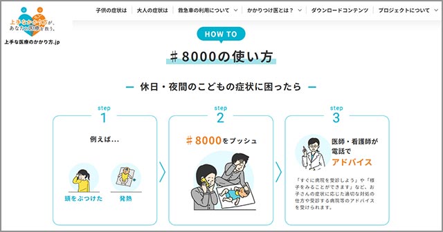 この事業は、全国統一の短縮番号♯8000をプッシュすることにより、住いの都道府県の相談窓口に自動転送され、小児科医師・看護師から子どもの症状に応じた適切な対処の仕方や受診する病院などのアドバイスを受けられる。