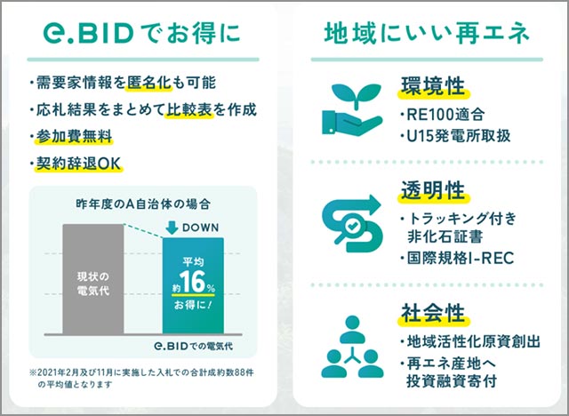 さらに、独自再エネ電力入札システム「e.BID(いいビッド)」のリバースオークションを活用することで、小売事業者の間に競争原理が働き、電力価格の低減を実現している。