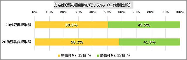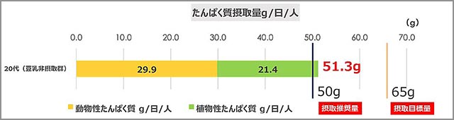 そしてリセッ豆乳プロジェクトが2025年6月に全国20代40代女性の3日間食事記録調査「豆乳摂取による食生活影響調査」を実施したところ、豆乳非摂取群(豆乳を飲まない人たち)20代女性の1日当たりのたんぱく質摂取量は、51.3g……。