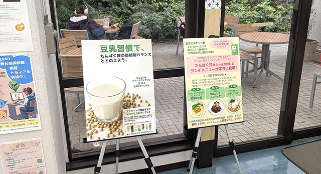 このリセッ豆乳プロジェクトでは、メニュー調理用となる豆乳の提供と、提供期間中、たんぱく質バランスランチを注文した学生を対象に豆乳を無料配布し、学生たちのたんぱく質不足をフォローしていく。