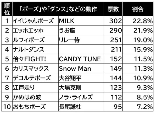 2位以降は、うお座「エッホエッホ」、世界陸上 男子4×100mリレー リレー侍「ルフィポーズ」「ナルトダンス」、CANDY TUNE「倍々FIGHT!」、Snow Man「カリスマックス」、大谷翔平「デコルテポーズ」、大場克則「江戸走り」、ノラ・ライルズ「かめはめ波」、なにわ男子 長尾謙杜「おもちポーズ」と続いた。