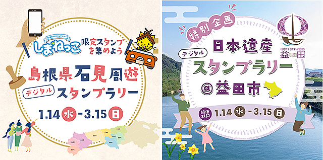 島根県石見周遊デジタルスタンプラリー(1/14~3/15)は、浜田市・益田市・大田市・江津市・川本町・美郷町・邑南町・津和野町・吉賀町の対象スポットをめぐって「しまねっこ限定スタンプ」を集めると、地域特産品や温泉入浴ペアチケットを抽選でプレゼント☆