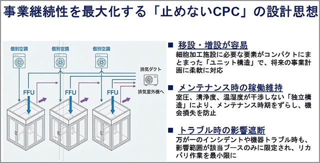 ◆移設・増設が容易:細胞加工施設に必要な要素がコンパクトにまとまった「ユニット構造」で、将来の事業計画に柔軟に対応