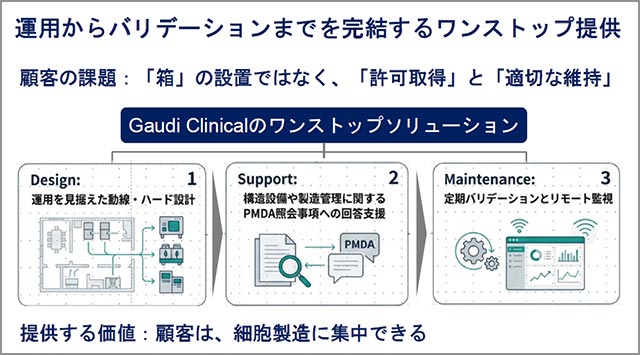 Gaudi Clinical は、この医療機関近接型コンパクト細胞製造ユニット Gaudi Clinical「KiOSK」(据置型室圧可変式小型クリーンブース)をさらに再生医療の提供オペレーションにおける最適化をめざした検証を重ね、地域分散都市型再生医療流通網の拠点として、地域医療機関との細胞製造の委受託を展開していく。